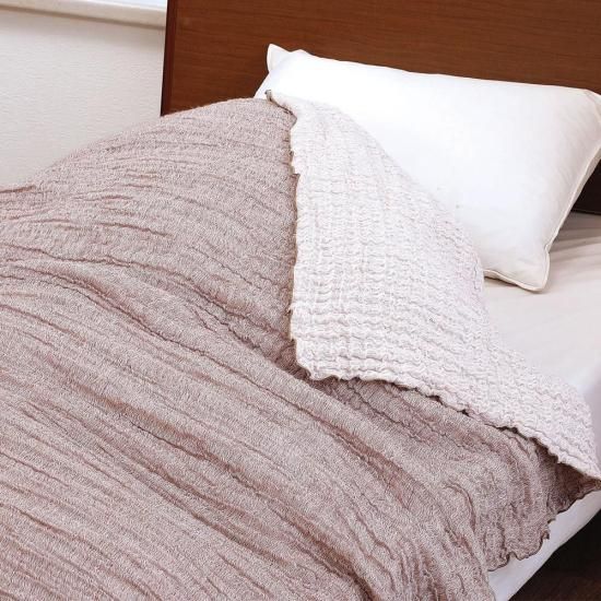 凹凸のあるウェーブ生地が伸び縮みするので、寝返りしても身体の動きに合わせて毛布がついてくるので、ズレることなく、たっぷりとした伸縮性で身体をやさしく包みます。毛布と身体の間にすき間をつくらないので、冷気が布団の中に入ってくるのを防ぎ、同時に体温をしっかり捉えて逃さず、自然なぬくもりを保ちます。さらに、3重ガーゼ構造なので、軽くふんわりとしたボリュームがあります。ガーゼならではの通気性で吸収した汗も素早く放出してムレません。
