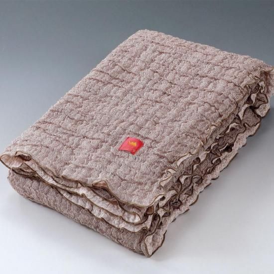 キャメルとオーガニックコットンのふんわりふわふわの一年中活躍する毛布です。